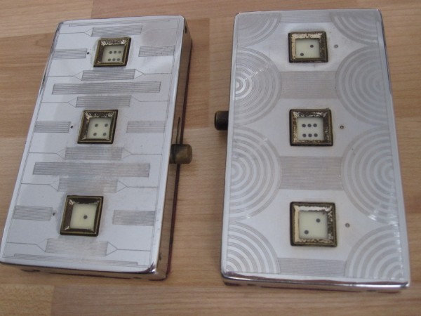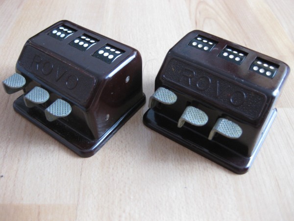 Hier nun links ein sehr alter ROVO mit vertieften Zahlen (Farbe wurde in die Vertiefungen "reingetupft", erst mit der Hand, später mit der oben gezeigten Maschine), rechts ein schöner, auch früher ROVO aus/für Großbritannien. Im Ausland findet sich auch immer die passende Bezeichnung, dass es sich bei den ROVOs um Spielgeräte im Art Déco handelt.